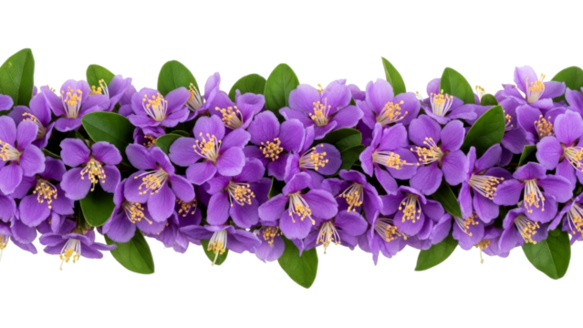 Vibrant purple flowers with green leaves and bright yellow stamens create a beautiful horizontal floral border, perfect for spring and summer designs.