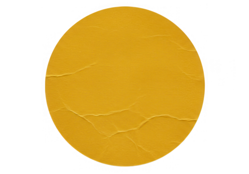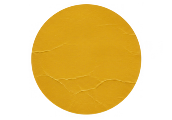 A yellow round sticker with a cracked surface is isolated on transparent background
