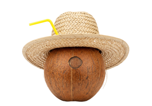 Isolated coconut face wearing a straw hat with yellow straw, summer beverage presentation