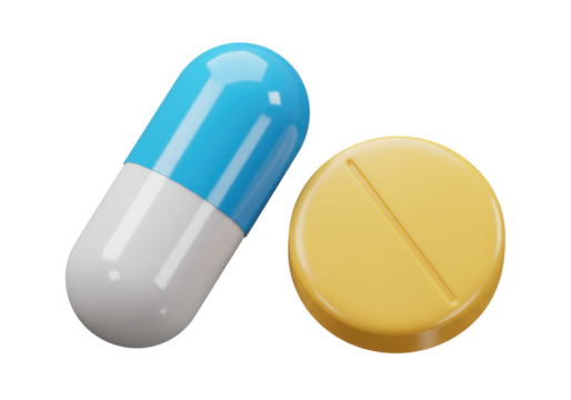 Blue and white capsule with yellow tablet isolated on transparent background, medicine and healthcare concept for medical use