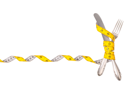 diet, slimming: silver knife and fork wrapped with yellow tape measure