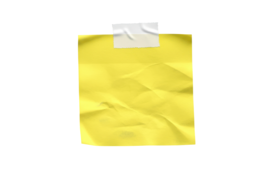 A crumpled yellow sticky note with white tape attached, isolated on a transparent background
