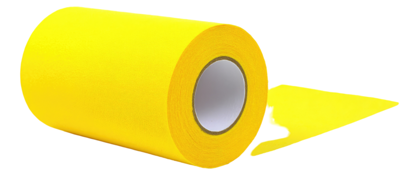 Brown Cardboard Box Wrapped with Bright Yellow Tape on Plain White Background