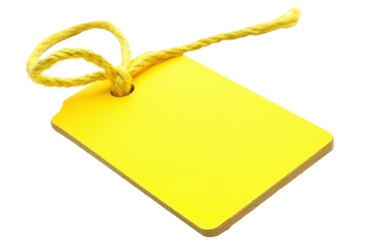 Blank yellow price tag with rope isolated on transparent background. Vibrant yellow price tag with a string perfect for labeling products isolated on white background.