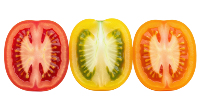 Multicolored tomatoes: red, yellow, orange, green on round wooden board on transparent background. Close-up view of the top