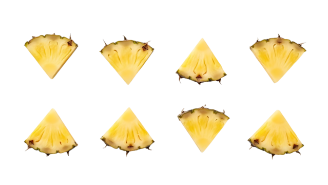 Eight triangular slices of fresh pineapple fruit isolated on transparent background