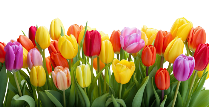 Close up of a vibrant red and yellow tulip flower with green leaves isolated on transparent background