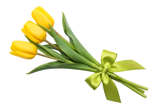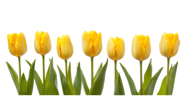 Five vibrant yellow tulip buds with dew drops, green stems, elegantly arranged on transparent background. Pristine product photography concept