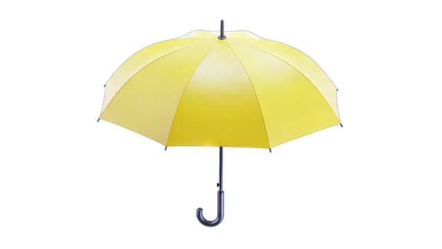 A bright yellow umbrella with a curved wooden handle is isolated on a transparent background ready for use in any weather isolated on transparent background