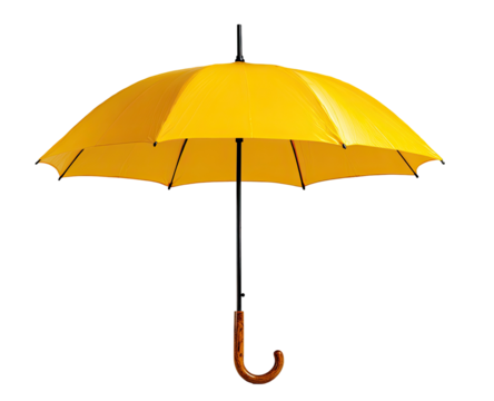 A bright yellow umbrella with a curved wooden handle is isolated on a transparent background ready for use in any weather isolated on transparent background