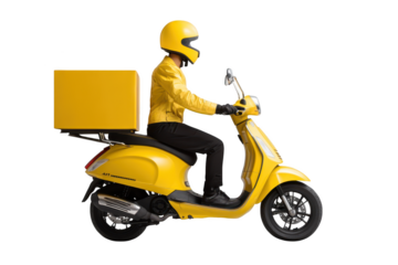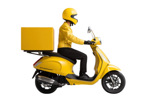 Male courier in yellow uniform and helmet riding scooter with delivery box on transparent background