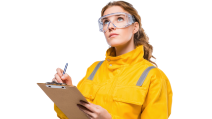 Safety inspector in yellow uniform with clipboard, isolated on white background.