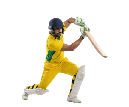 Cricketer in yellow uniform playing batting shot isolated on white background