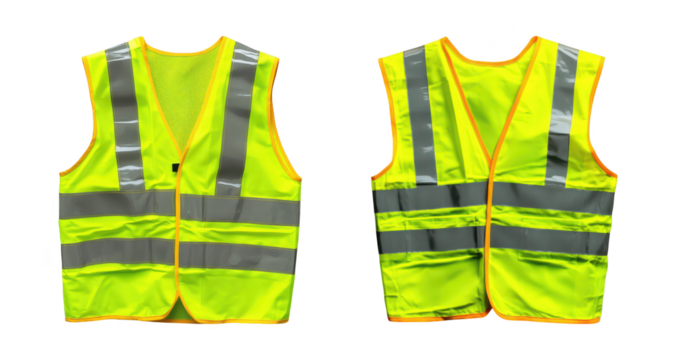 Yellow Safety Vest. A photograph showcasing a yellow safety vest highlighting its visibility and importance in hazardous environments. on White or PNG Transparent Background.