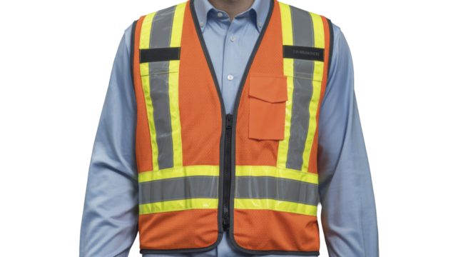 High visibility neon yellow safety vest with reflective strips, isolated on transparent background