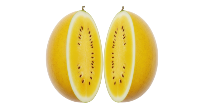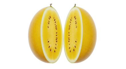 Isolated Yellow Watermelon halves, juicy and refreshing tropical fruit for summer diet