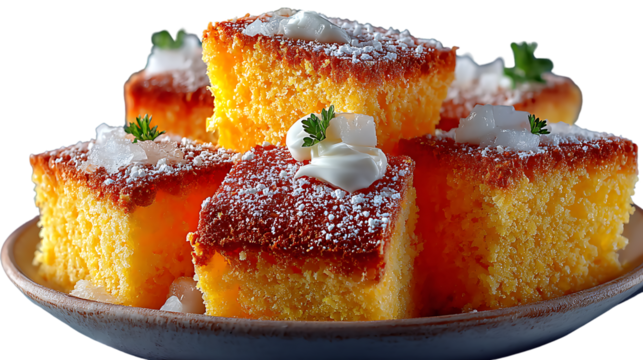 Sweet dessert squares golden cake delicious confectionery creamy topping powdered sugar gar