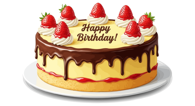 Delicious birthday cake with fresh strawberries and chocolate drizzle