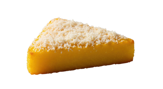 A triangular slice of a fluffy yellow cake with layers of white cream filling, generously covered in shredded white coconut, presented on a simple white plate against.