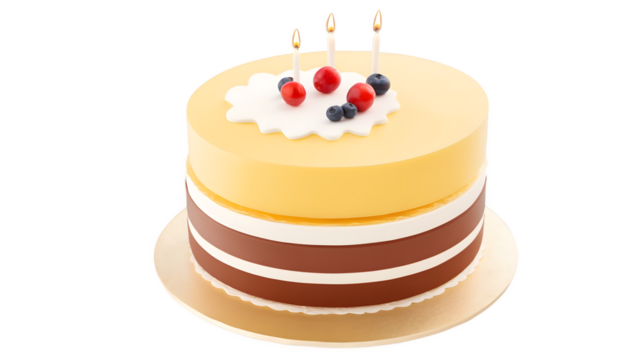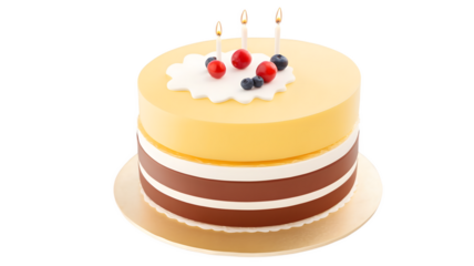 Three-tiered yellow cake with star candles isolated PNG, festive dessert for birthdays and celebrations on transparent background