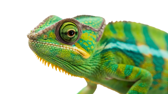 chameleon green lizard animal isolated on white background veiled reptile with colorful skin and camouflage closeup of eye and tail exotic tropical wildlife side view of yemen chameleon in nature