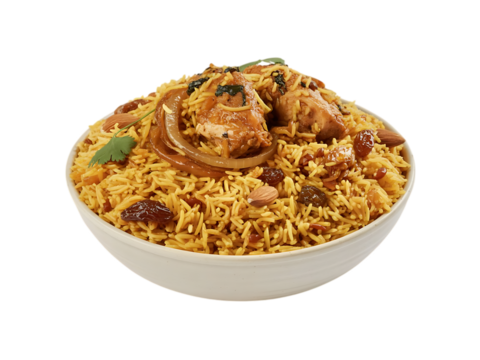 Chicken mandi rice plate isolated on transparent background