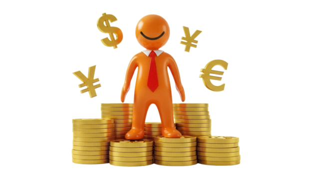 Orange cartoon character standing on gold coins isolated PNG, surrounded by dollar, euro, and yen symbols, financial success and wealth concept