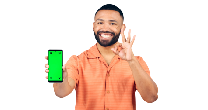 Happy man, portrait or ok sign with phone, green screen or success on a transparent PNG background. Isolated male person showing mobile smartphone or chromakey display with like emoji or okay gesture