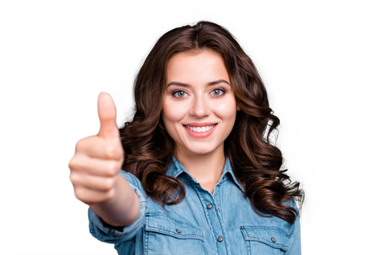Close-up portrait of stylish nice cute charming lovely attractive cheerful adorable brunette girl with wavy hair in casual denim shirt, giving thumb-up, promo, isolated over grey background