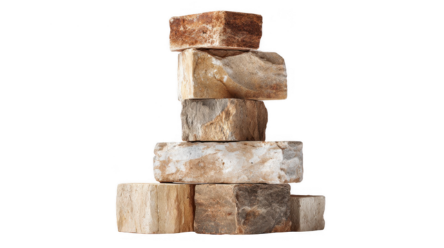 Stacked rough hewn stones balancing precariously on a transparent background, representing the intricate relationship between past, present, and future in a harmonious display of stability and time