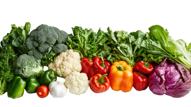 Fresh vegetables including broccoli, peppers, lettuce, and cabbage, isolated on white.