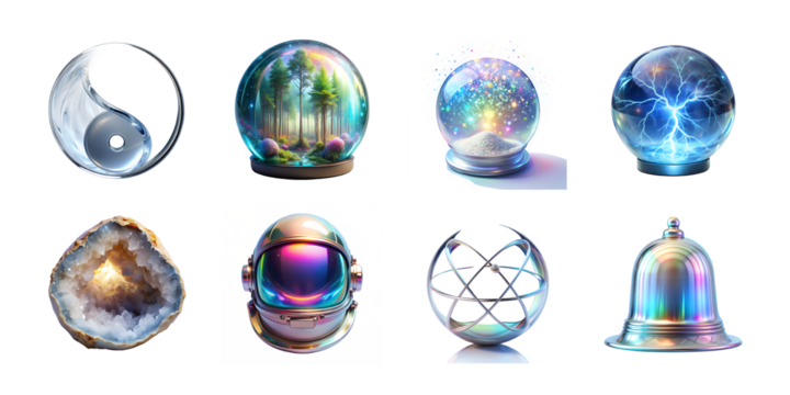 Holographic icons isolated on transparent background, yin yang, forest and lightning