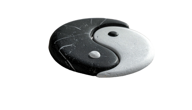 Black pebble next to stacked white pebbles with the yin yang symbol, against a solid black background