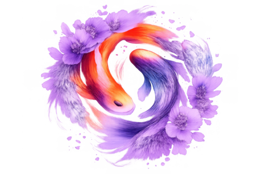 Two koi fishes symbolizing yin yang harmony and balance, swimming in a vibrant circular watercolor flow with ethereal flowers