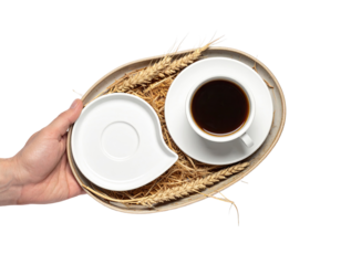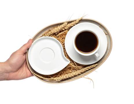 Hand holds oval tray with coffee cup and wheat stalks, yin-yang design