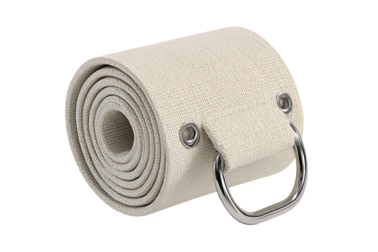 Rolled yoga strap made of cotton webbing with plain metal D-rings, isolated on transparent background.