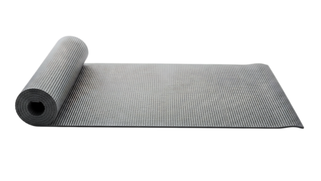 Rolled up grey yoga mat for fitness and exercise isolated on a transparent background