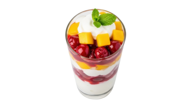 Delicious layered dessert with yogurt, cherries, and mango isolated PNG, parfait for healthy eating and sweet treat