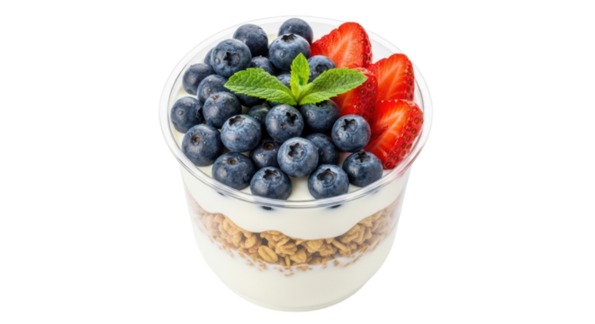 Delicious yogurt parfait with granola, blueberries, and strawberries isolated PNG, healthy breakfast dessert on transparent background