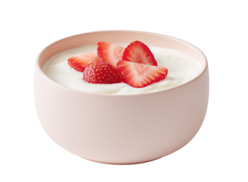 Pink bowl of yogurt garnished with fresh strawberries on transparent background