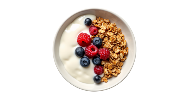 Bowl of greek yogurt and fresh berries. Isolated on Transparent background.