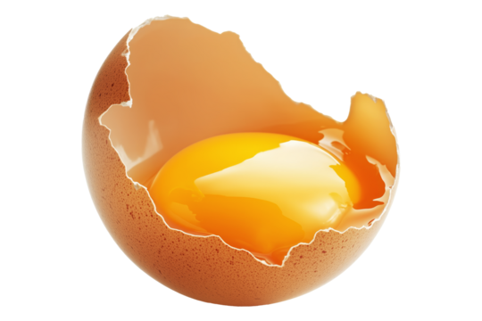Close-up of cracked brown egg with yolk inside eggshell, isolated on white transparent background. Concept of Easter, food, fertility, and organic nutrition