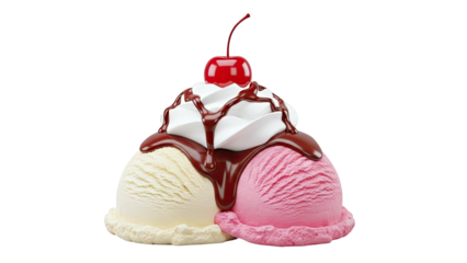 Vanilla and Strawberry Ice Cream Sundae with Chocolate Drizzle and Cherry