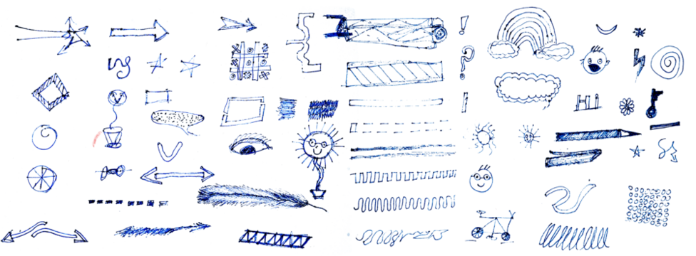 Blue pen scribble and doodle collection. Blue pen lines, arrows and scribbles at grid notebook background. Crayon drawn note doodles for hand drawn diagram, infographic and journaling.