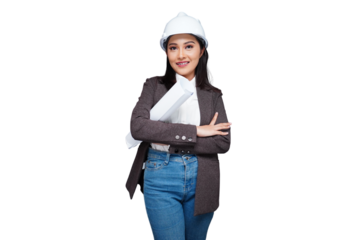 Beautiful young female architect wearing a helmet is carrying a roll of paper isolated transparent