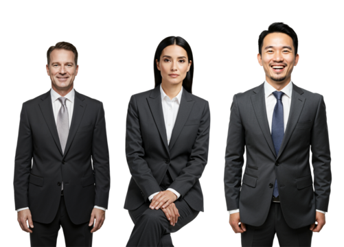 Diverse group of three business professionals, including an Asian man and a Black woman and man, wearing suits and ties, posing in a studio against a transparent background.