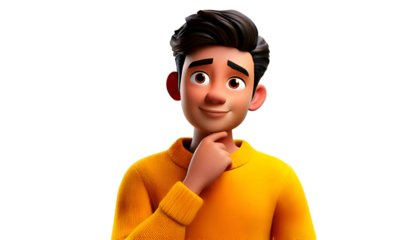 Think question doubt cartoon character young adult man boy teen person in yellow sweater on transparency background PNG
