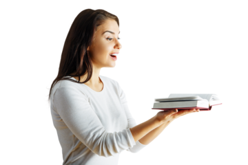 Woman holding an open book, wearing a white top, isolated on a clean white background. Concept of reading, learning, and education