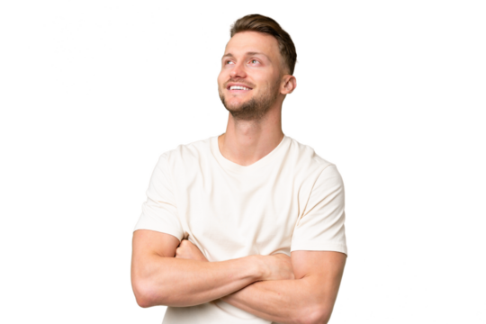 Young blonde caucasian man over isolated background looking up while smiling