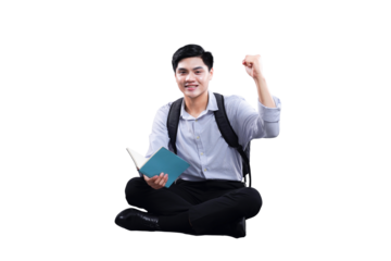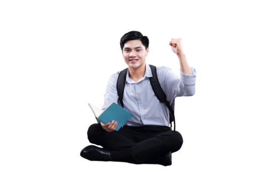 Happy Student with Textbook: Capturing a young student's moment of inspiration, holding a textbook and raising a fist in the air, radiating joy, and knowledge.